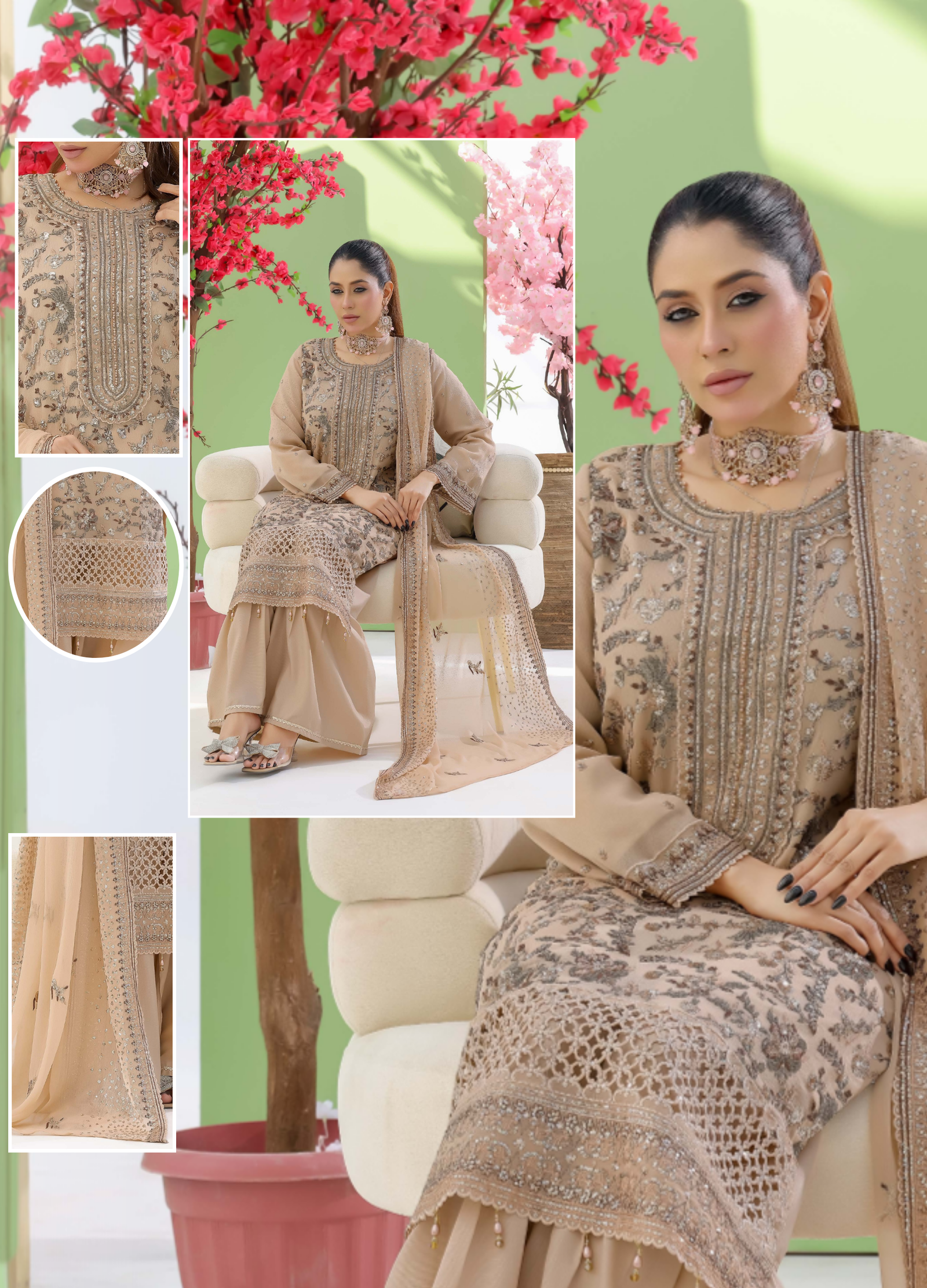The Zaiqa – Premium Luxury Chiffon Collection offers a semi-stitched chiffon shirt and dupatta, both adorned with heavy luxury embroidery and stunning embellishments that catch the light beautifully. Whether you are attending a grand wedding or a formal festive dinner, the Zaiqa – Premium Luxury Chiffon Collection ensures you stand out with timeless sophistication and grace.